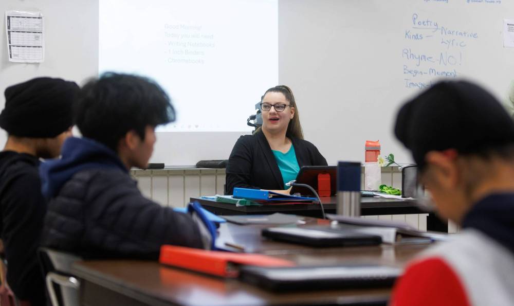 Sarah Anderson teaches Grade 10 students at Maples Collegiate during an English Language Arts (poetry unit) class. (Mike Deal / Winnipeg Free Press)