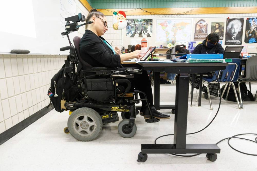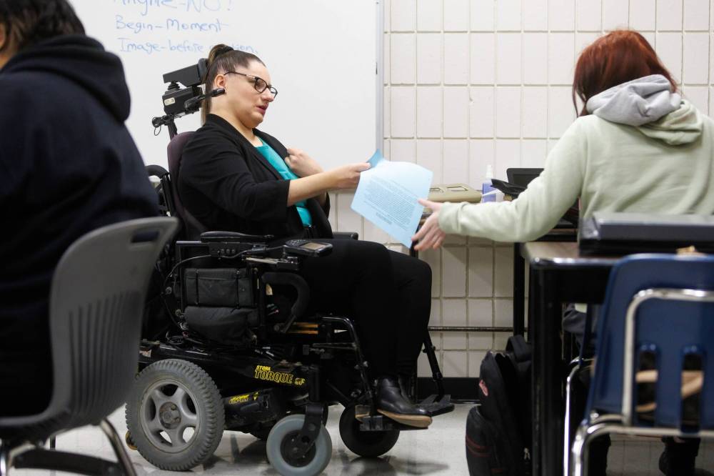Sarah Anderson teaches Grade 10 students at Maples Collegiate. She has little functioning in her arms and navigates school in a wheelchair. (Mike Deal / Winnipeg Free Press)