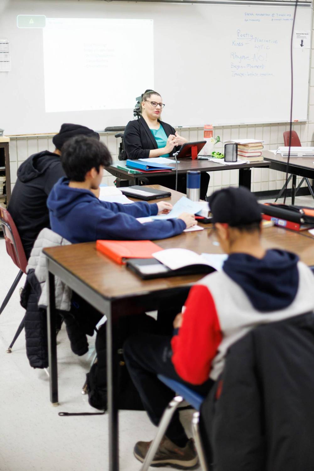 The whir of her wheelchair is a constant in the background while students work on independent assignments; she zips around to check in with those battling writers’ block — a necessity as part of her encouraging teaching style that is centred around “choice, voice and agency.”