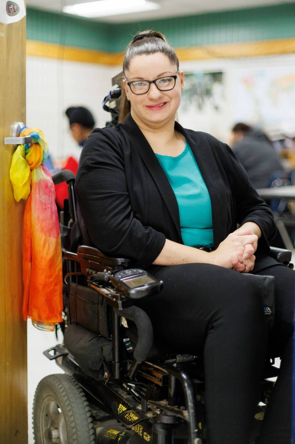Being the sole educator in the Seven Oaks School Division who teaches in a wheelchair full time, Anderson is also simultaneously inventing workarounds in a high school built with 1980 accessibility standards in mind. Among them, she has tied a multicoloured scarf to her classroom’s door so she can grasp it to close the entryway with ease.