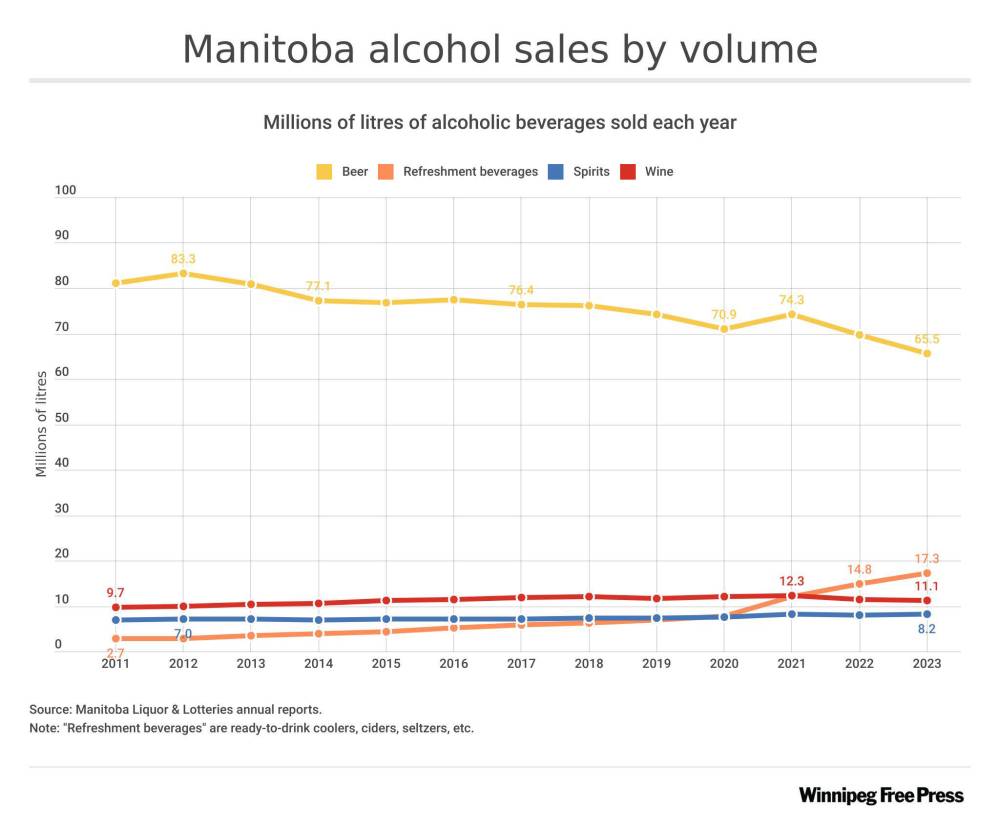Despite the drop in sales, beer remained Manitobans’ favourite alcoholic beverage, with 65.5 million litres sold in the province.