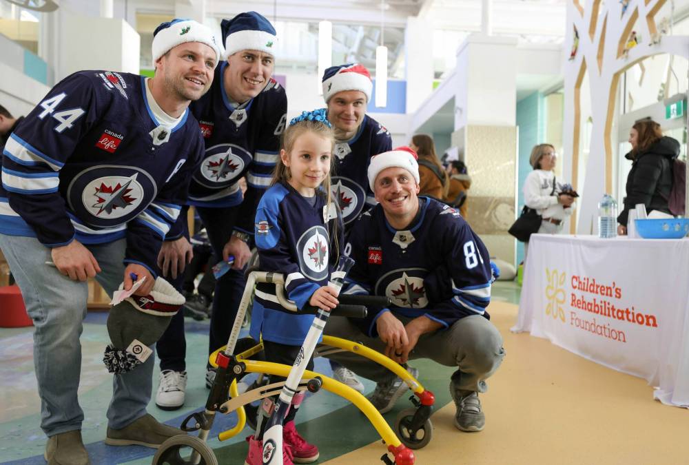 RUTH BONNEVILLE / WINNIPEG FREE PRESS From left, Josh Morrissey, Logan Stanley, Vladislav Namestnikov and Nate Schmidt pose for a photo with Jets fan Shalese Brown, age 7, during the Winnipeg Jets annual holiday visit to the Rehabilitation Centre for Children Wednesday.