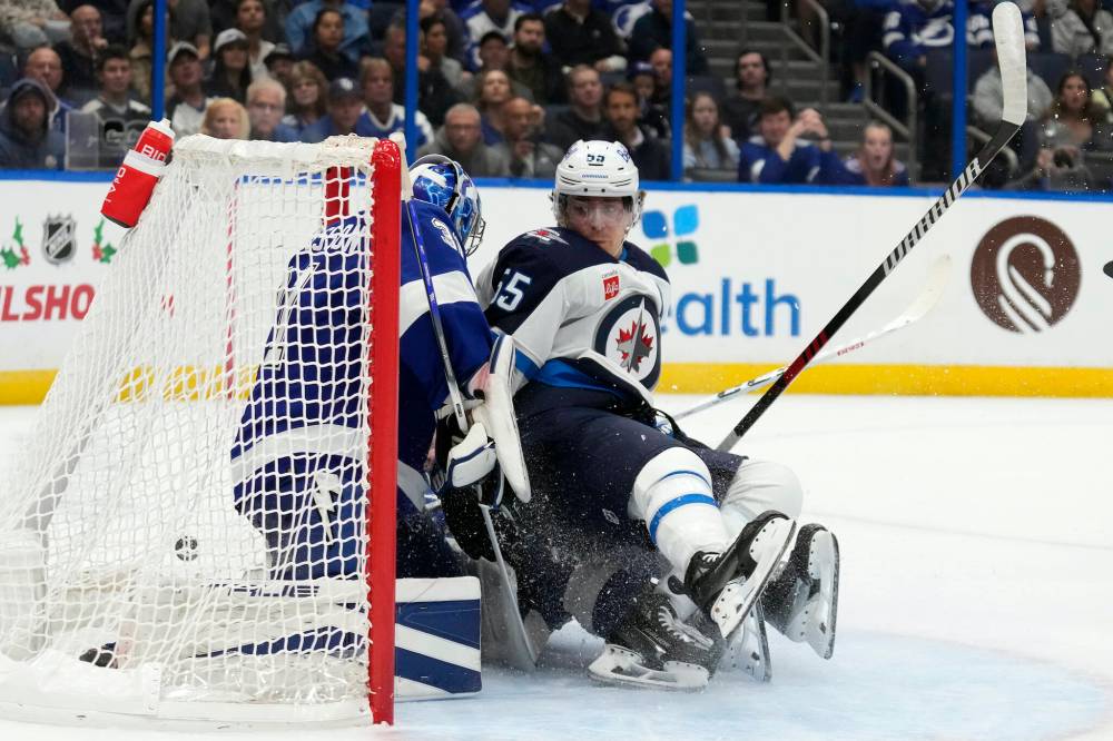 Chris O'Meara / The Associated Press Jets centre Mark Scheifele crashes into Tampa Bay Lightning goaltender Jonas Johansson following a scoring chance Wednesday.