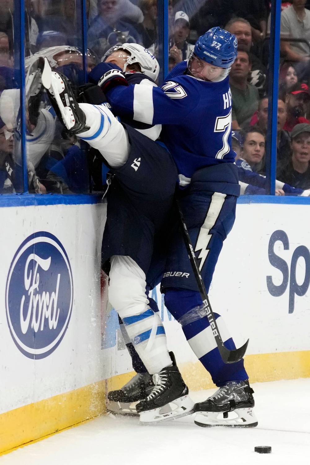 Chris O’Meara / The Associated Press Tampa Bay Lightning defenceman Victor Hedman pins Winnipeg Jets’ Mason Appleton to the boards during the third period.