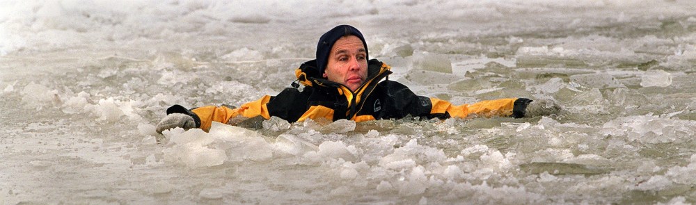 Giesbrecht performs a demonstration of how to survive after falling through ice in 2001.