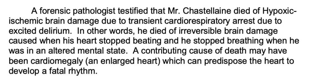 In her 2018 inquest report, Judge Anne Krahn expressed doubt Chastellaine was in a state of excited delirium before he lost consciousness. More likely, she wrote, the physical exertion of the struggle caused Chastellaine’s heart to stop, as he had an enlarged heart.
