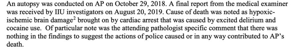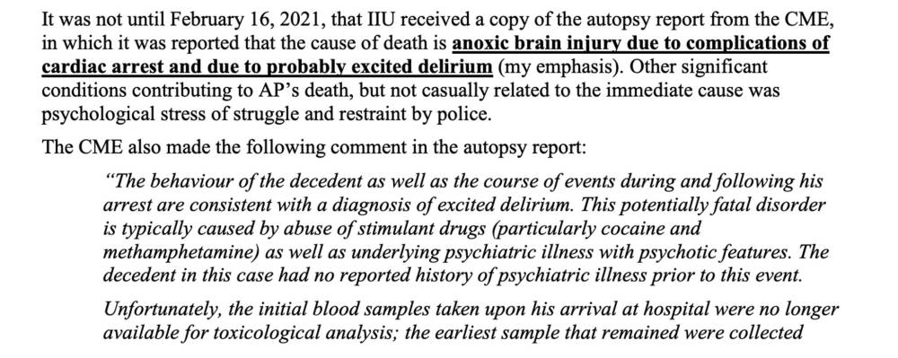 “Uncontrolled and un-treated bi-polar and schizophrenia can be a cause of excited delirium. The presence of drugs is not always a factor,” the IIU wrote, citing the CME’s response.