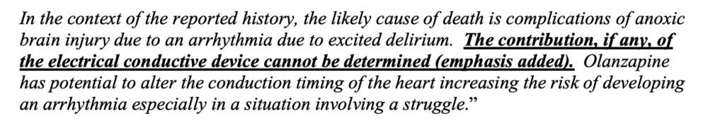 “None of us would certify excited delirium as a cause of death without attributing it to the underlying condition that produced it (for instance, we would say something along the lines of ‘cardiac arrhythmia due to excited delirium due to cocaine toxicity’),” Younes said, noting excited delirium results either from “drug toxicity or psychotic episode.”
