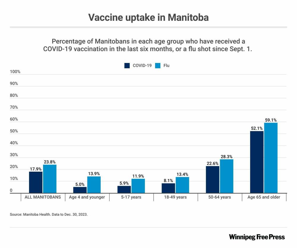 Provincial vaccination rates against influenza and COVID-19 remain relatively low for the general population. Less than 24 per cent of Manitobans have received a recent seasonal flu shot; nearly 18 per cent got a COVID-19 vaccine or booster shot within the past six months.