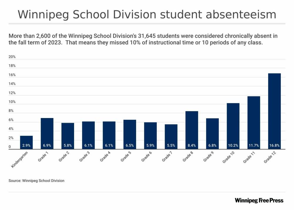 A new analysis of attendance in the Winnipeg School Division shows Grade 8 marks a turning point for students, while more final-year students are missing class regularly than peers in younger grades.