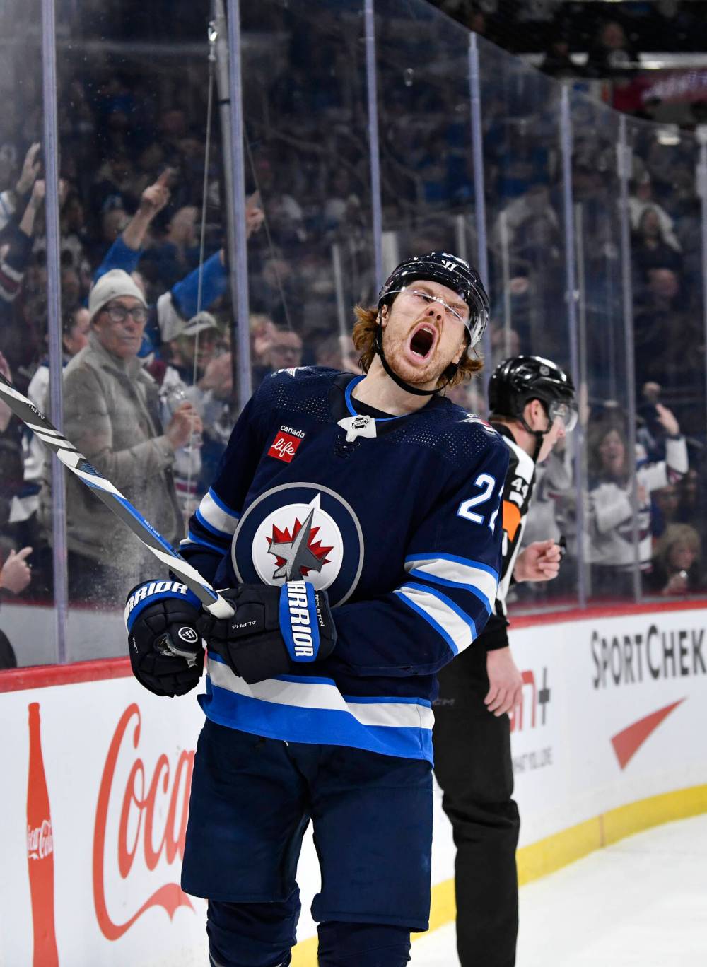 THE CANADIAN PRESS/Fred Greenslade Winnipeg Jets’ Mason Appleton celebrates his goal against the New York Islanders during the second period.