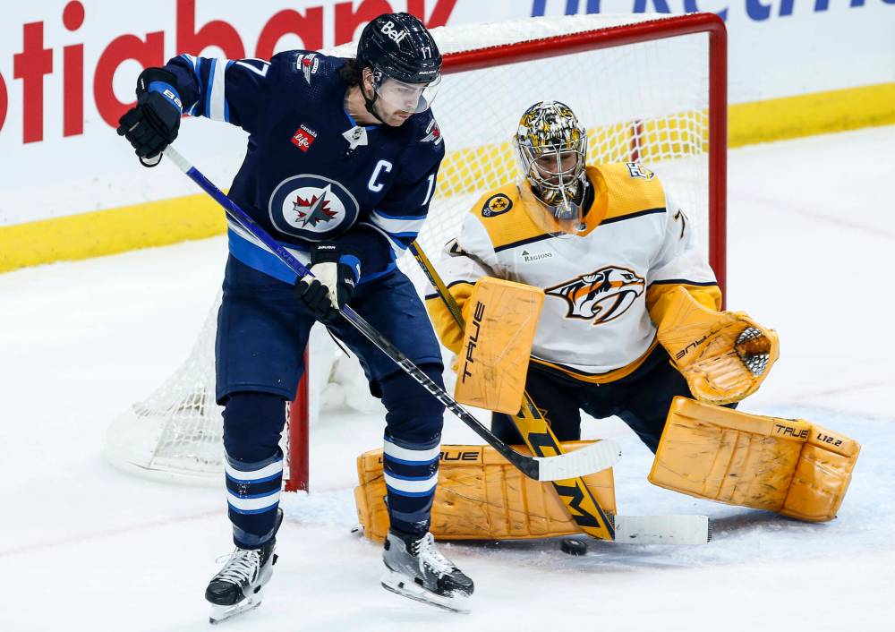 John Woods / THE CANADIAN PRESS files Winnipeg Jets captain Adam Lowry distracts Nashville Predators goaltender Juuse Saros.