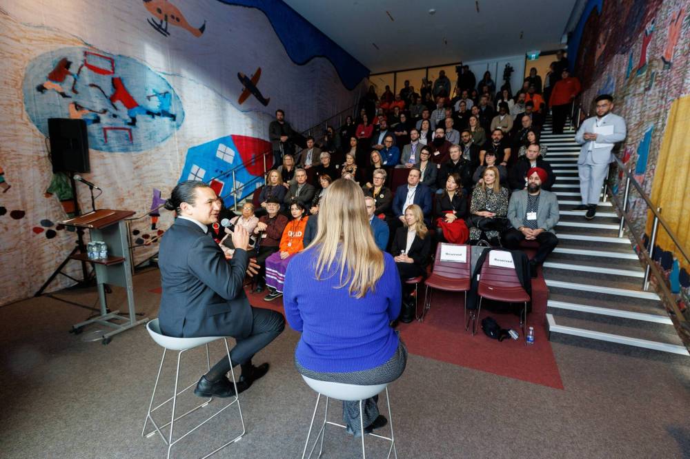 Premier Wab Kinew takes part in the Downtown Winnipeg BIZ Speaker Series moderated by Kate Fenske, CEO, Downtown Winnipeg BIZ, Friday morning at the WAG-Qaumajuq. Kinew says he wants Manitoba to stop being a have-not province and start being a have province.