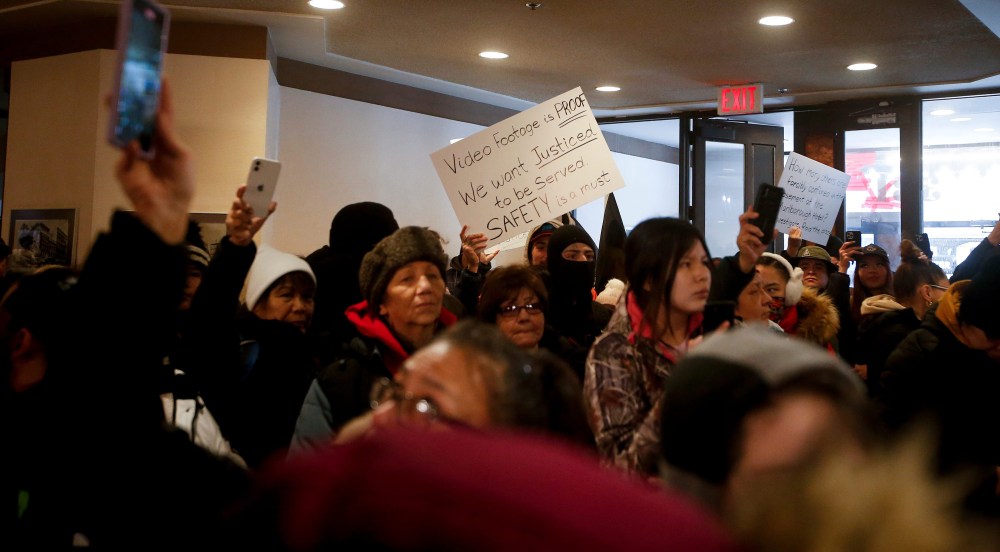 Upstairs, on the downtown hotel’s main floor, dozens of people had gathered in protest after a four-week old video of an Indigenous woman restrained and confined inside the hotel lobby circulated online.