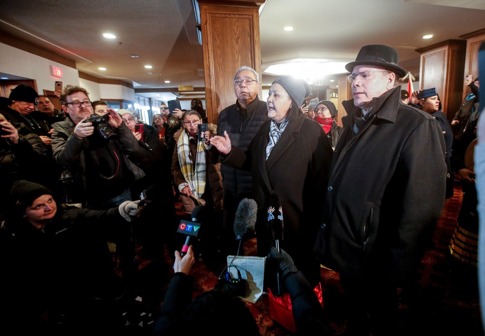 As a large crowd of protesters sang Indigenous songs, pounded drums and called for justice in the lobby, a separate group split off and went downstairs.