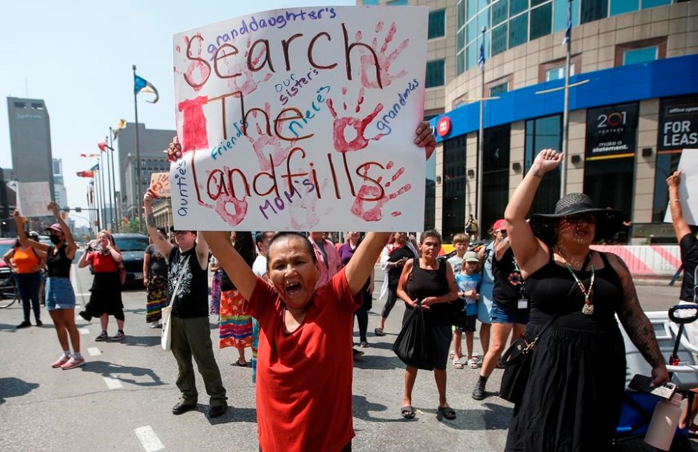 The Assembly of Manitoba Chiefs is to discuss details today about a report into the logistics of searching a Winnipeg-area landfill for the remains of two slain First Nations women. Family and supporters gather to protest all levels of governments' lack of action in funding a search of Winnipeg's landfills for missing women at Portage and Main in Winnipeg, Thursday, August 3, 2023.  THE CANADIAN PRESS/John Woods