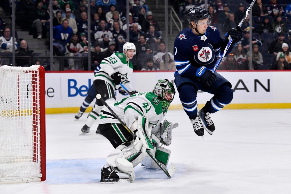 Vladislav Namestnikov jumps in front of Dallas Stars goaltender Scott Wedgewood ahead of an incoming shot during the second period of a game in Winnipeg in November.“I kind of expect that from myself. Sometimes I get bumped up and can play another role, and sometimes I get bumped down. I guess that’s the versatility I can bring to the team.”