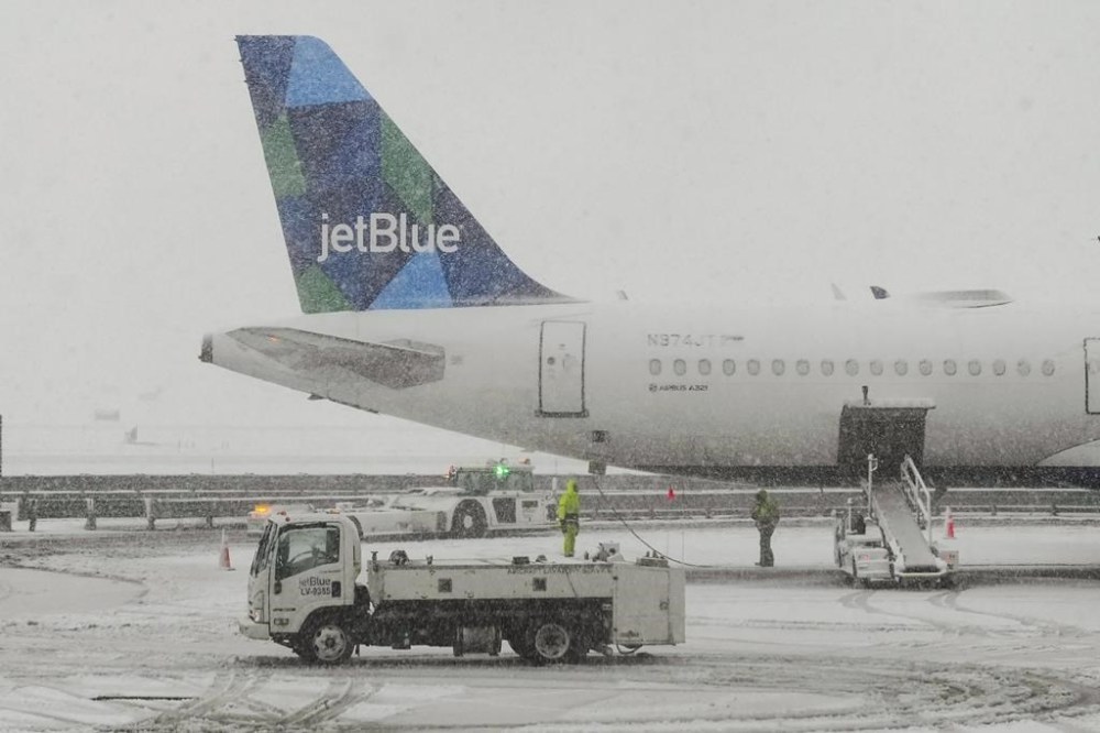 Workers fuel a plane as snow falls at John F. Kennedy International Airport Tuesday, Feb. 13, 2024, in New York. (AP Photo/Frank Franklin II)