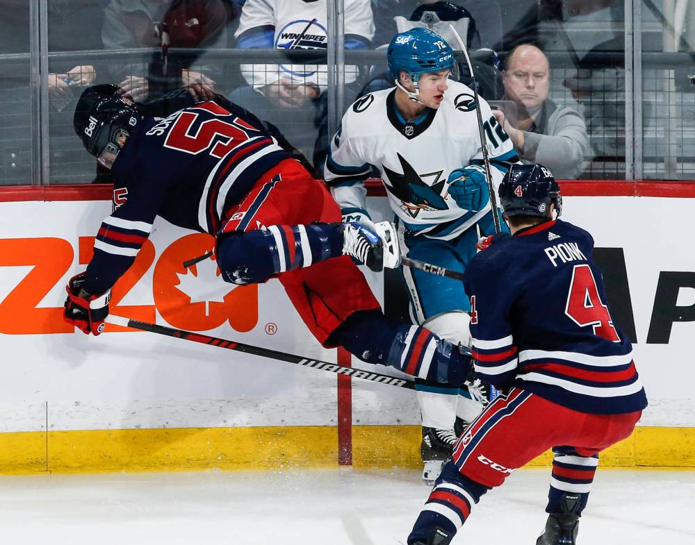 THE CANADIAN PRESS/John Woods Winnipeg Jets’ Mark Scheifele and San Jose Sharks’ William Eklund collide as Neal Pionk defends during the first period on Wednesday.