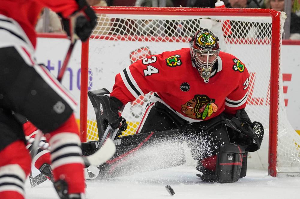 (AP Photo/Erin Hooley) Chicago Blackhawks goaltender Petr Mrazek eyes the puck during the first period.