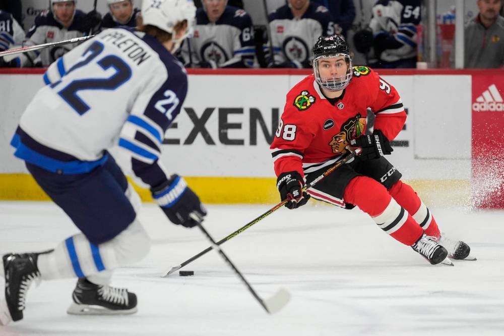 (AP Photo/Erin Hooley) Chicago Blackhawks centre Connor Bedard, right, handles the puck during the second period against the Jets, Friday.