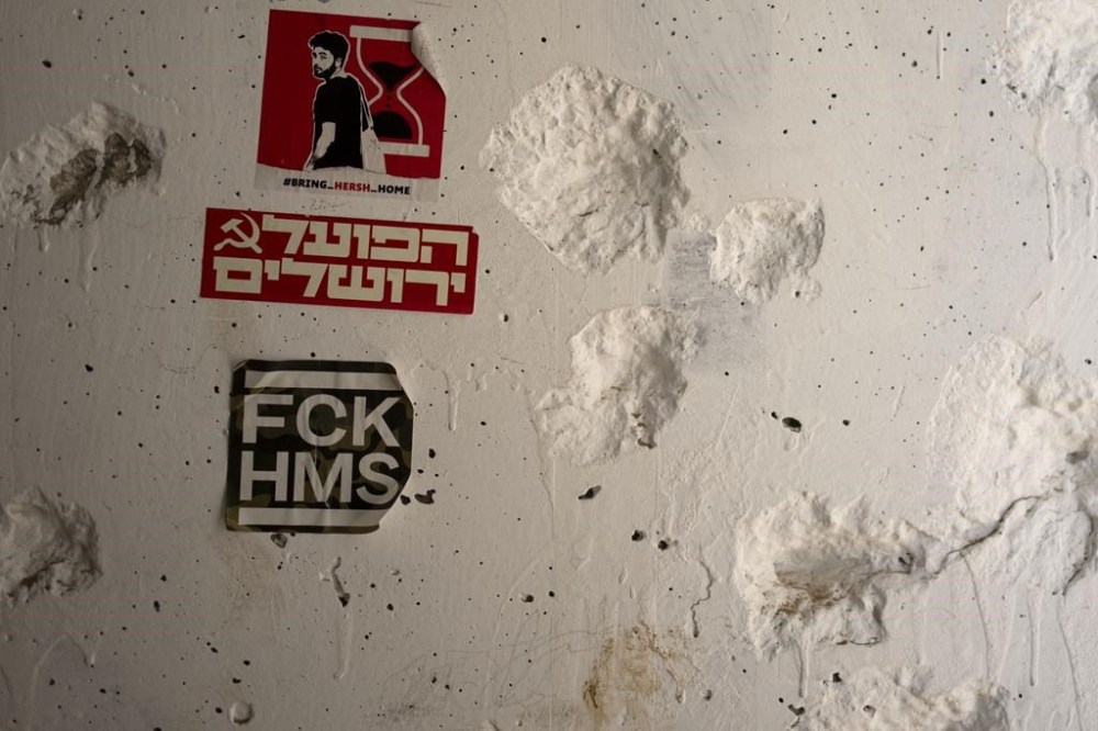 A sticker depicting Israeli-American hostage Hersh Goldberg-Polin on the wall of the bomb shelter in Re'im, southern Israel at the Gaza border, Monday, Feb. 26, 2024 where he was kidnapped to Gaza by Hamas on Oct. 7, 2023. (AP Photo/Maya Alleruzzo)