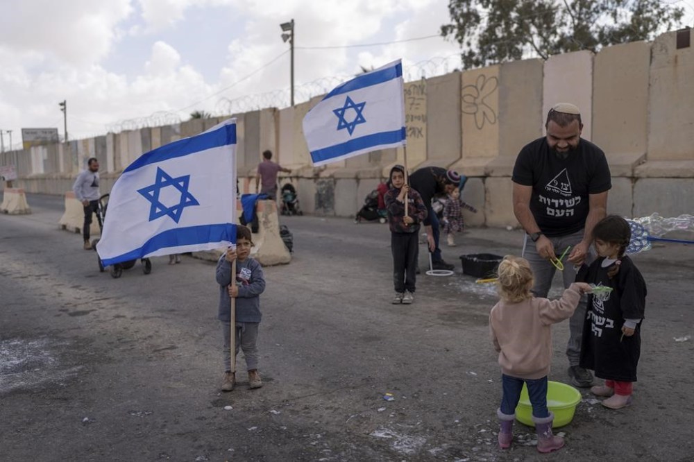 People gather at Israel's Nitzana border crossing with Egypt in southern Israel, Tuesday, Feb. 27, 2024, protesting against the delivery of humanitarian aid to the Gaza Strip until all hostages held by Hamas militants are released. Israel inspects international aid bound for Gaza before it is delivered into the territory. (AP Photo/Ohad Zwigenberg)
