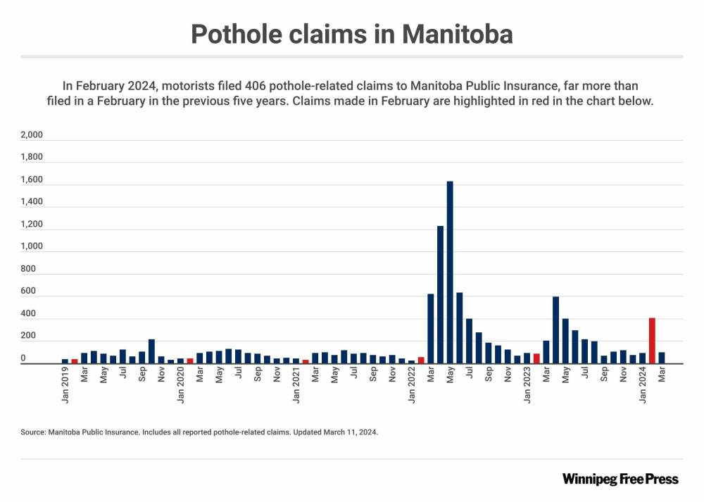 The number of pothole-related damage claims submitted to Manitoba Public Insurance in February was 372 per cent higher than the same period in 2023.