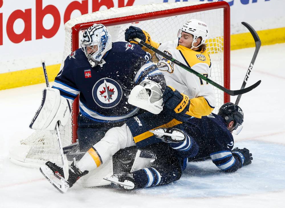 John Woods / THE CANADIAN PRESS The was plenty of action in front of the Jets’ net Wednesday night as Dylan DeMelo and Nashville’s Mark Jankowski crash into Jets goaltender Connor Hellebuyck.