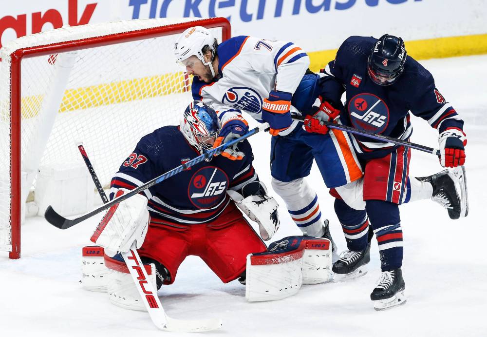 John Woods / THE CANADIAN PRESS Vincent Desharnais of the Oilers crowds Jets goaltender Connor Hellebuyck.