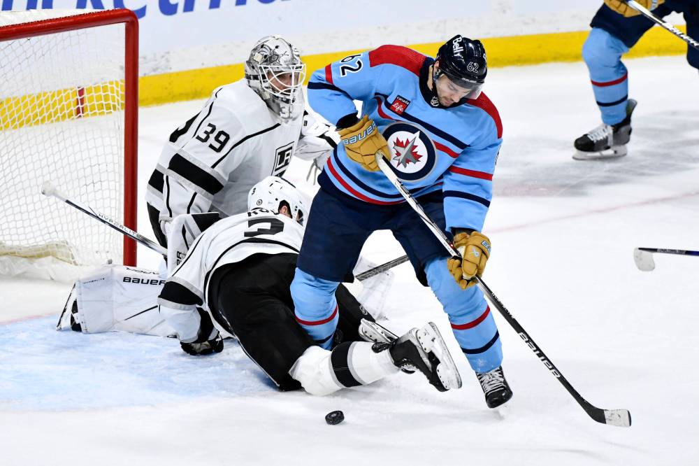THE CANADIAN PRESS/Fred Greenslade Los Angeles Kings' Matt Roy gets tangled up with Winnipeg Jets' Nino Niederreiter in front of Kings goaltender Cam Talbot during the third period.