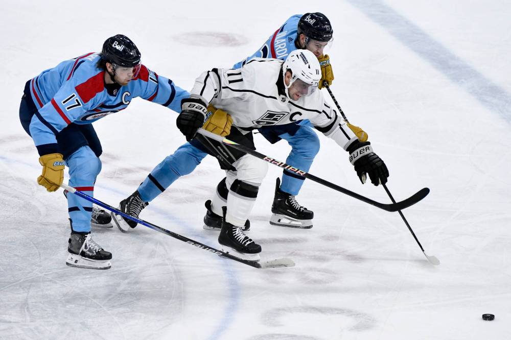 THE CANADIAN PRESS/Fred Greenslade Los Angeles Kings' Anze Kopitar is harassed by Winnipeg Jets players Adam Lowry and Gabriel Vilardi as he skates after a loose puck during the first period.
