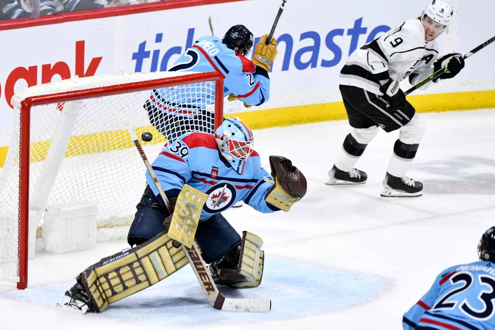 THE CANADIAN PRESS/Fred Greenslade Winnipeg Jets goaltender Laurent Brossoit lets a shot by Los Angeles Kings Anze Kopitar get through for a goal during the second period.