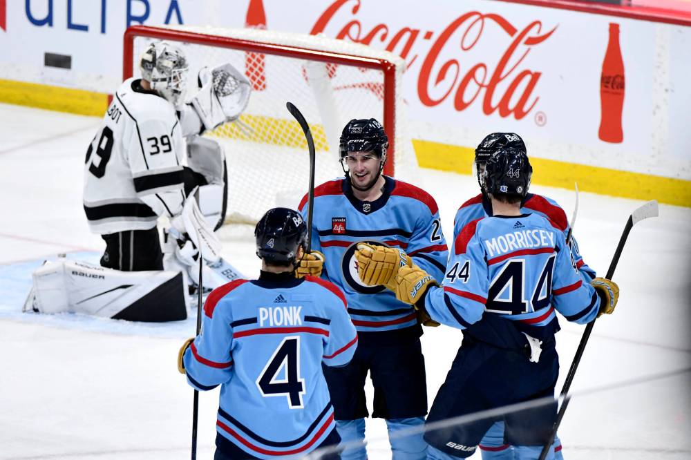 THE CANADIAN PRESS/Fred Greenslade Winnipeg Jets centre Sean Monahan celebrates his goal on Los Angeles Kings goaltender Cam Talbot with Neal Pionk and Josh Morrissey during the second period in Winnipeg on Monday.