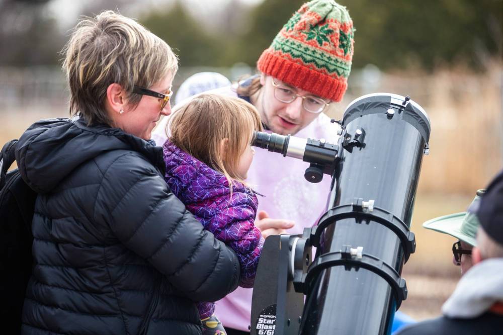 Willa Gerullis, age two, and her mom, Sara Gerullis, look through a telescope at the solar eclipse viewing party at The Leaf, Monday.