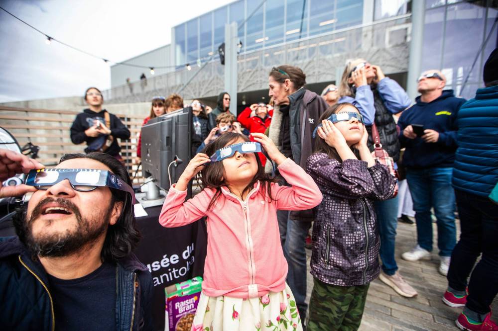 Rafael, Isabel, and Gabriel Reyes watch the solar eclipse at a viewing party at The Leaf in Assiniboine Park on Monday