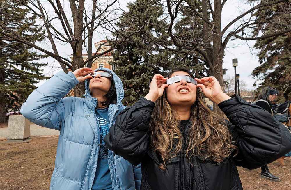 University of Manitoba students, Pari Joneidi (left) and Zahra Nanji, watch the solar eclipse with other students gathered on the Quad at the U of M, Monday.