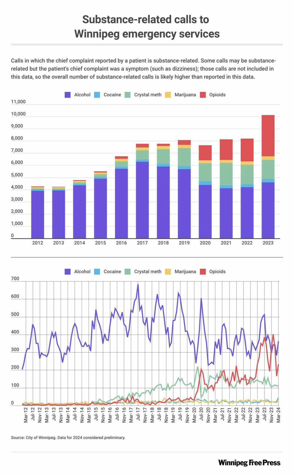 In Winnipeg, newly released numbers suggest emergency calls for people who consumed opioids are now surpassing those involving alcohol. In previous years, monthly data shows there were consistently hundreds more calls for alcohol than any other substance.
