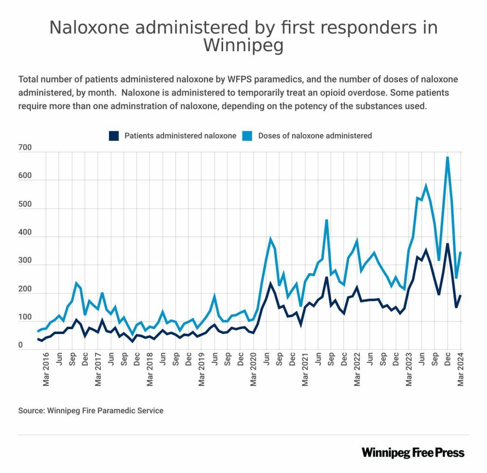 The number of times first responders administered naloxone — which reverses an opioid overdose — also increased dramatically in 2023, up by 50 per cent from the previous year. City data shows naloxone was administered by firefighters or paramedics to 3,124 people in 2023, compared to 2,054 in 2022, 1,904 in 2021 and 1,579 in 2020.