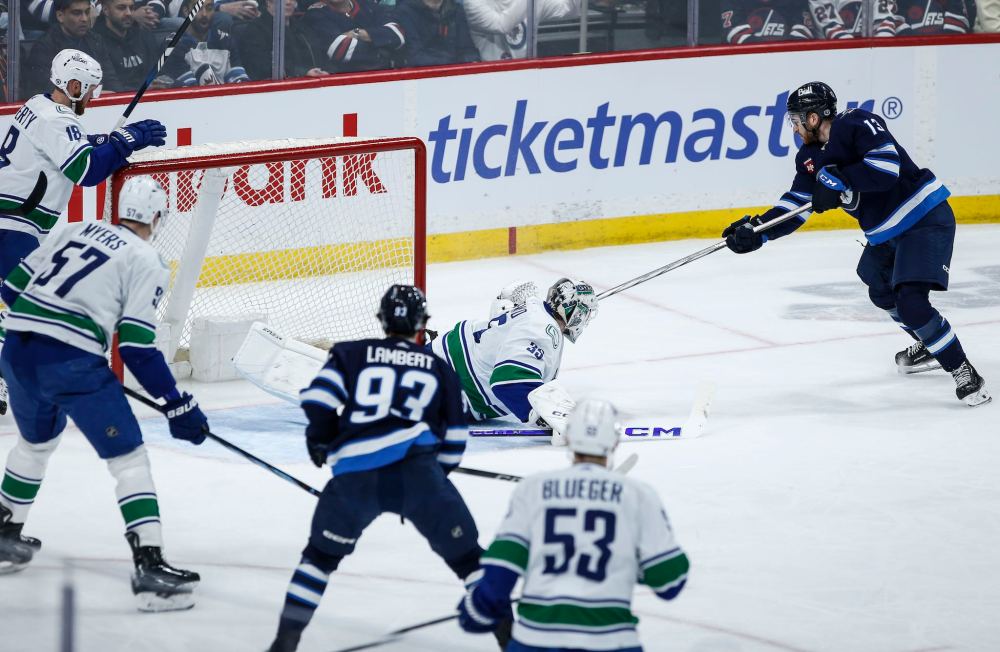 THE CANADIAN PRESS/John Woods Winnipeg Jets' Gabriel Vilardi scores on Vancouver Canucks goaltender Thatcher Demko during the first period as Brad Lambert looks on in Winnipeg, Thursday.
