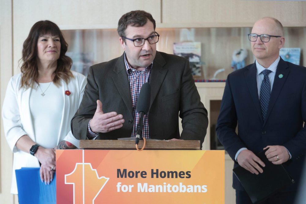 Ruth Bonneville / Free Press Housing Minister Bernadette Smith (from left) with Jeremy Read and Winnipeg Mayor Scott Gillingham, announces a new housing initiative for the Market Lands at Red River College Polytechnic, Thursday.