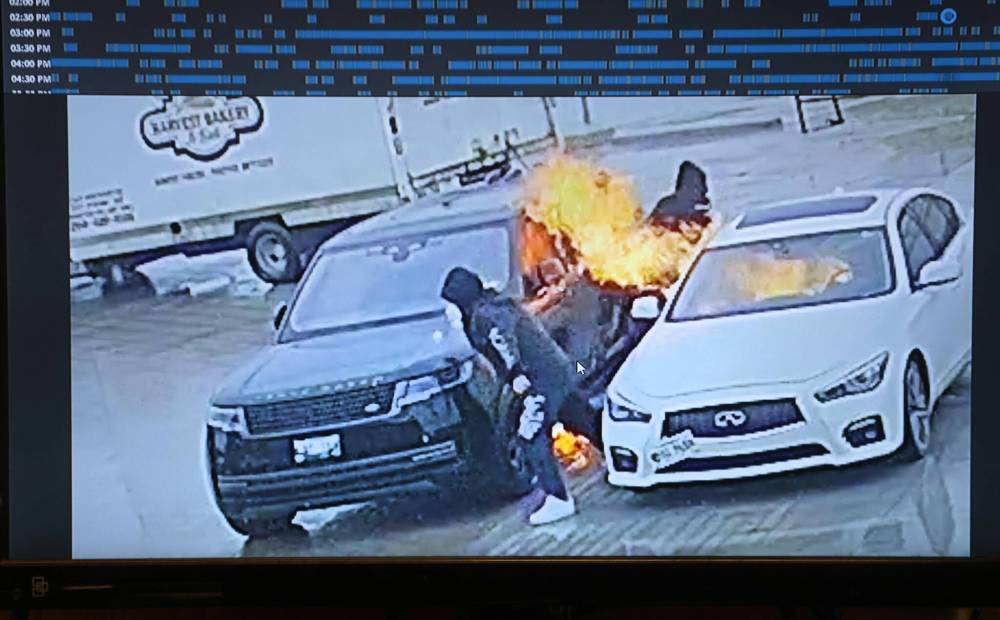 Footage shows two women approach Zeid’s cousin’s unoccupied car, smash a window and spray a flammable liquid inside, and then do the same to Zeid’s 2023 Range Rover.