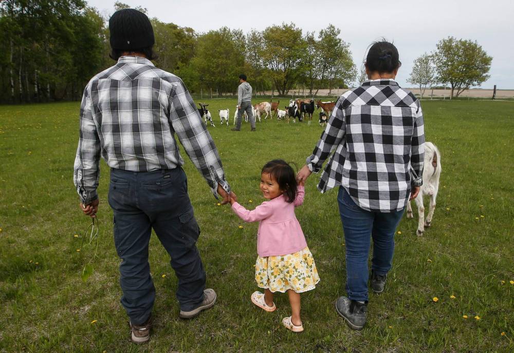 Thamu Eh's daughter Willow walks with Thamu's father Doh Htoo Eh (left) and mother Nyo You San at their multigenerational home north of Stonewall. (John Woods / Free Press)