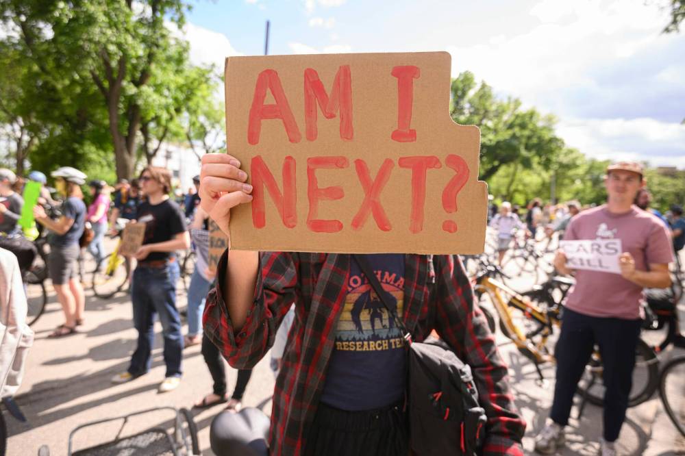 Mike Sudoma / Free Press A cycling advocate holds up a sign criticizing unsafe streets during a sit-in to mark a fatal vehicle-cyclist collision Thursday.