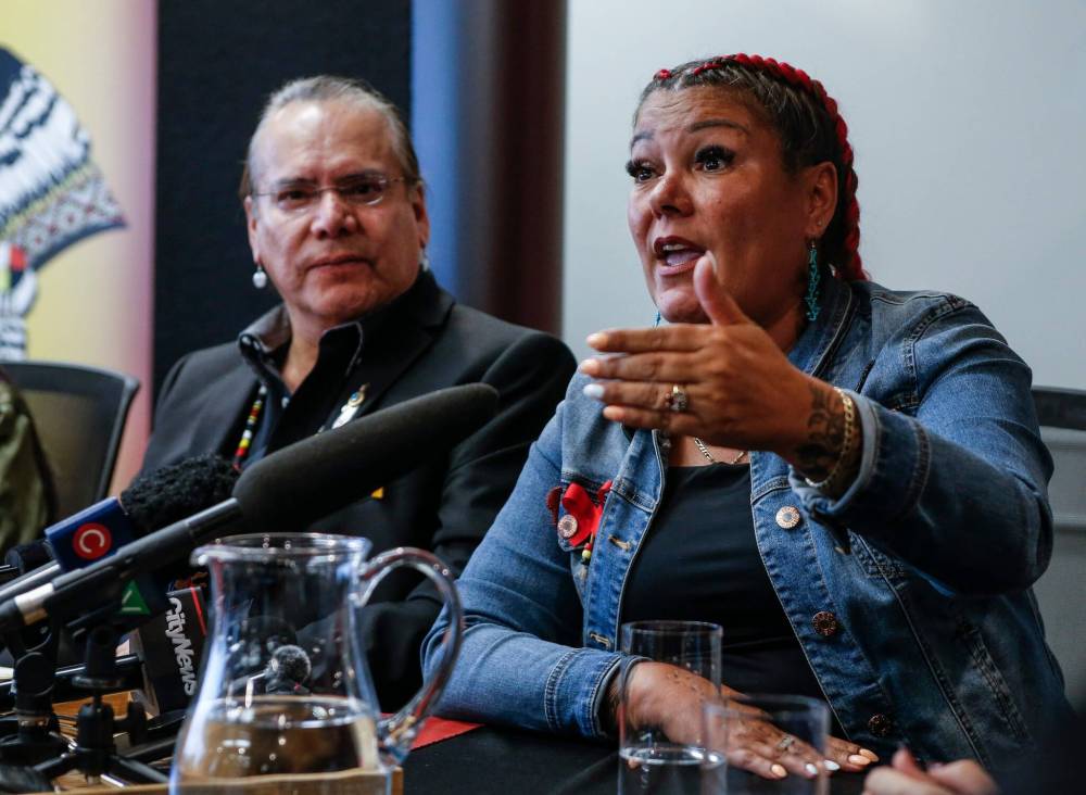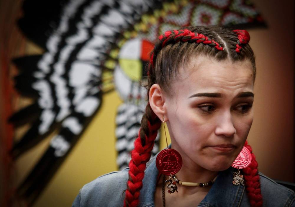 Cambria Harris listens to Assembly of Manitoba Chiefs grand chief Cathy Merrick speaks during the news conference. (John Woods / Free Press)