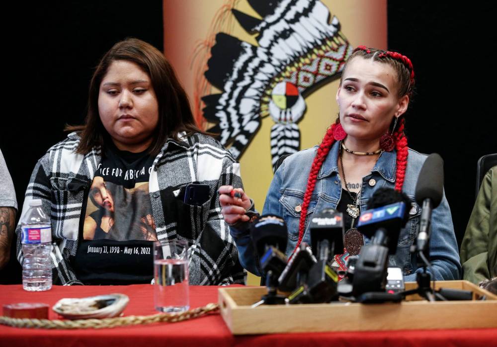 Cambria Harris, right, with Stephanie Contois, sister of Rebecca Contois, speaks at the news conference. (John Woods / Free Press)