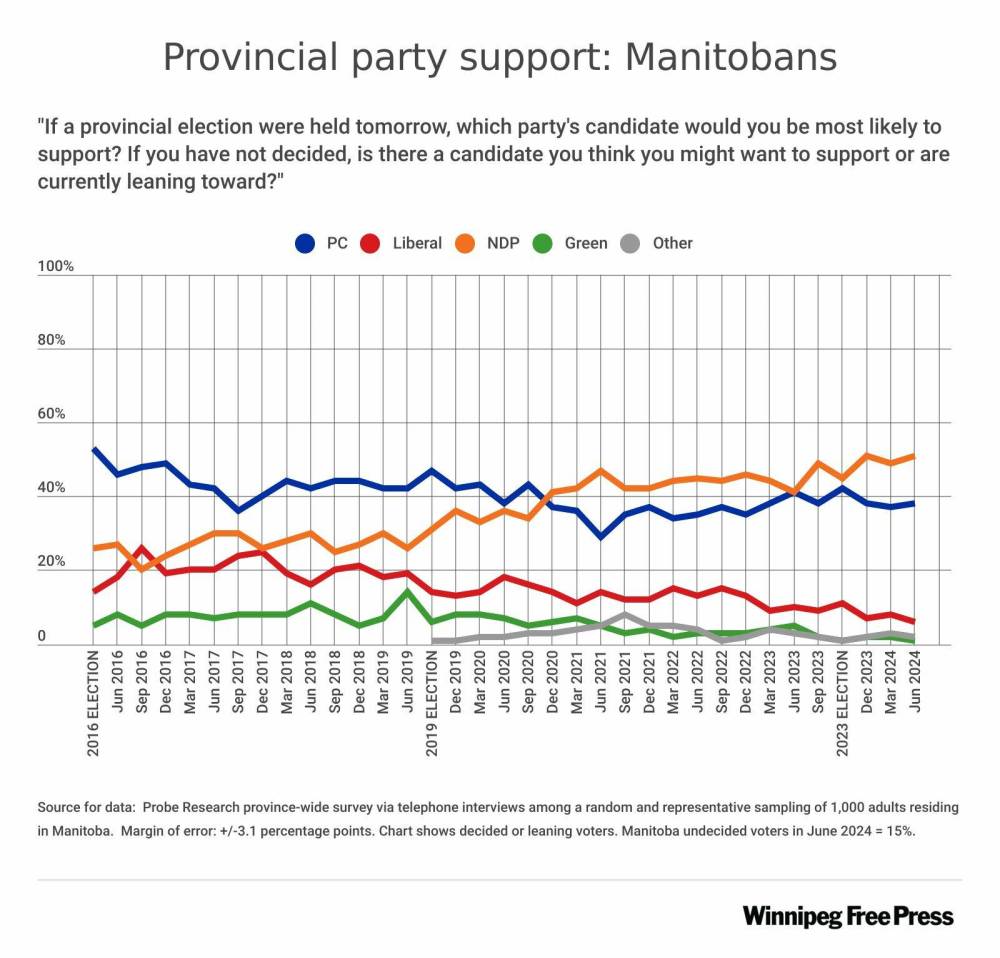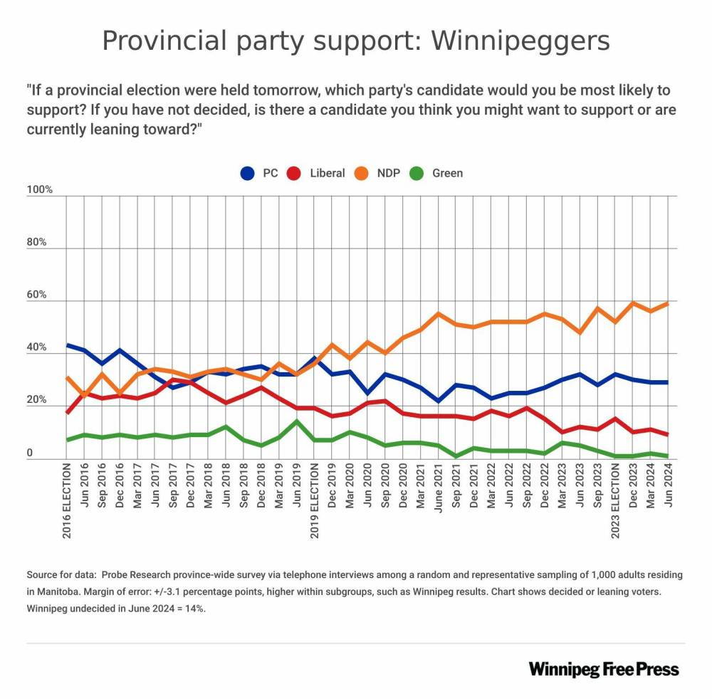 A Free Press-Probe Research poll shows the NDP has the support of almost six in 10 Winnipeggers, or 59 per cent, up three per cent from a poll taken in March and seven points higher than its vote percentage on Oct. 3, the night Wab Kinew became premier.