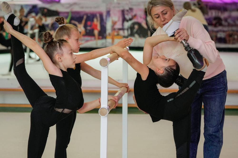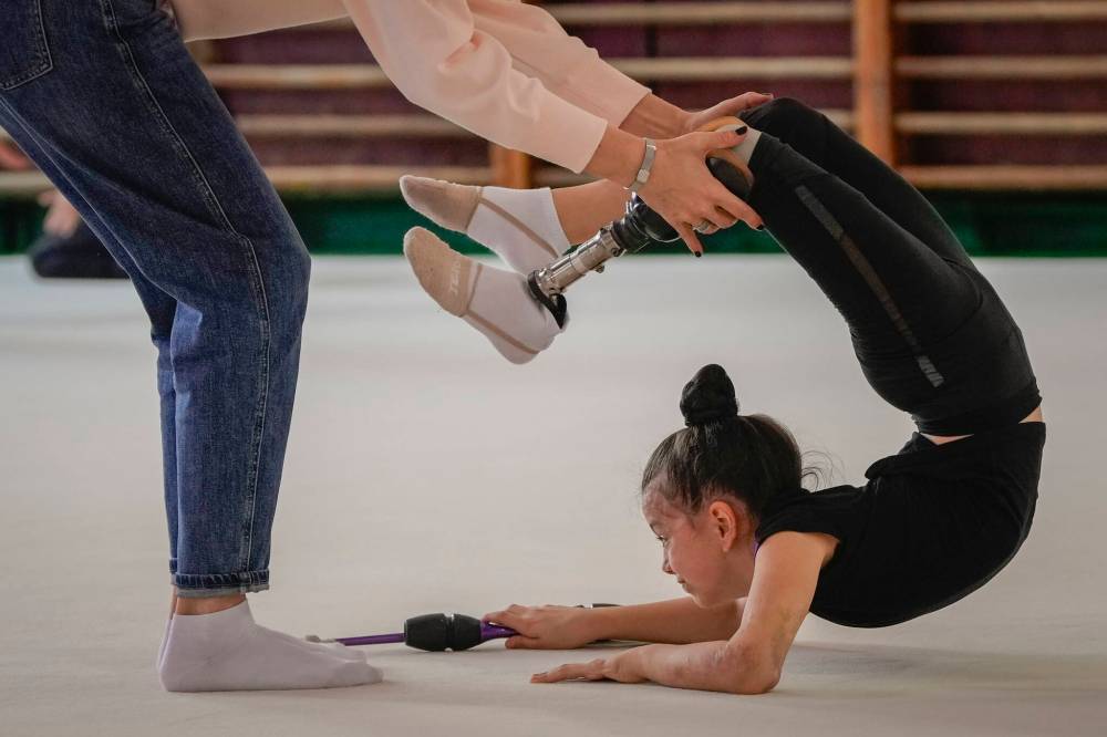 Oleksandra Paskal, an 8-year-old girl with a prosthetic leg, practises rhythmic gymnastics with other girls under the direction of coach Inga Kovalchuk in Chornomorsk, Odesa region, Ukraine, earlier this year. ‘My primary task today is not to achieve high results in sports but to preserve the mental and physical health of our children,’ the coach says.