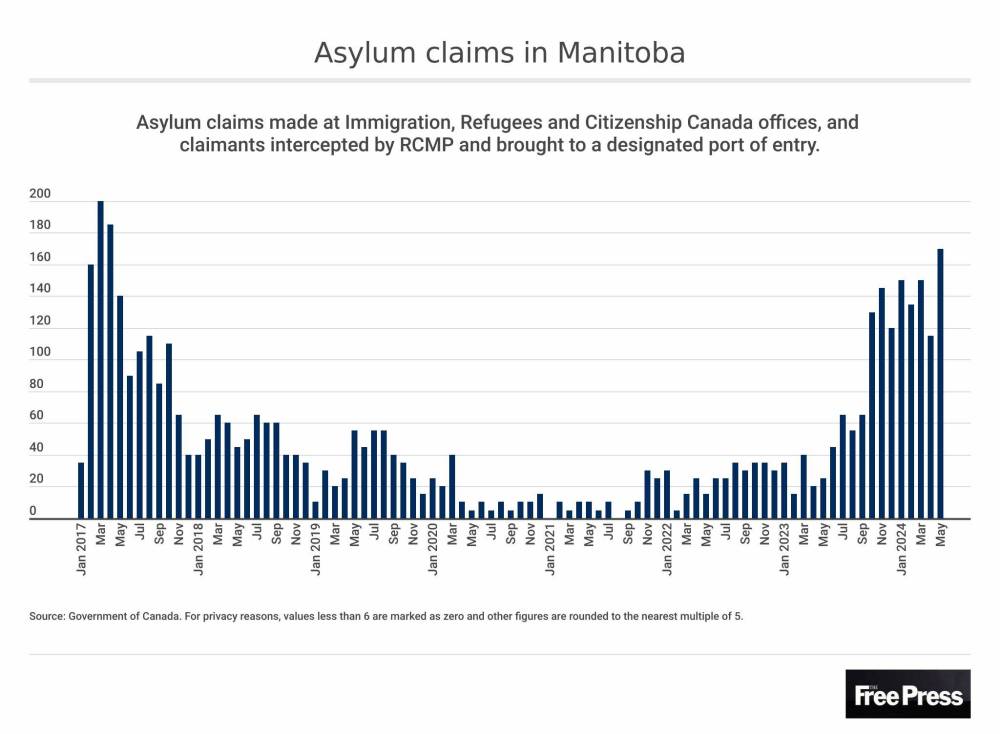 Immigration, Refugees and Citizenship Canada and the Canada Border Services Agency processed 720 asylum claims in Manitoba from January to May 2024, federal data show.