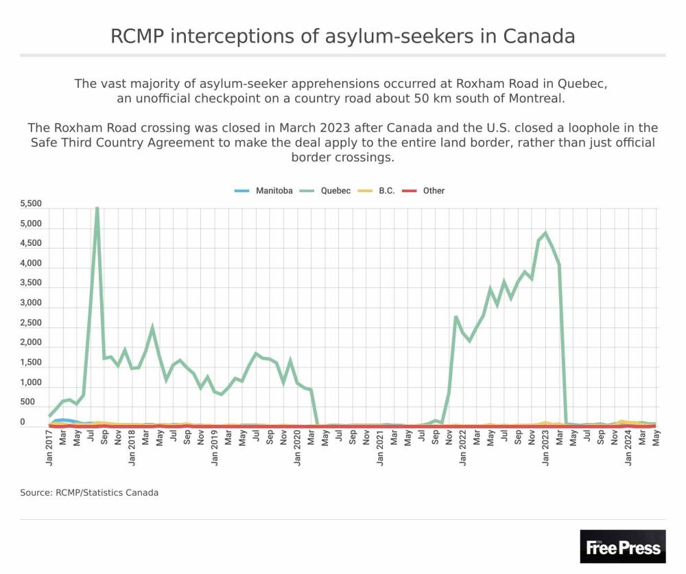 Manitoba RCMP officers, who patrol roughly 500 kilometres of the international border, intercepted 283 asylum seekers from January to May 2024, federal data show.